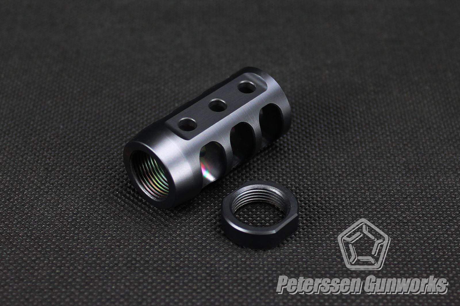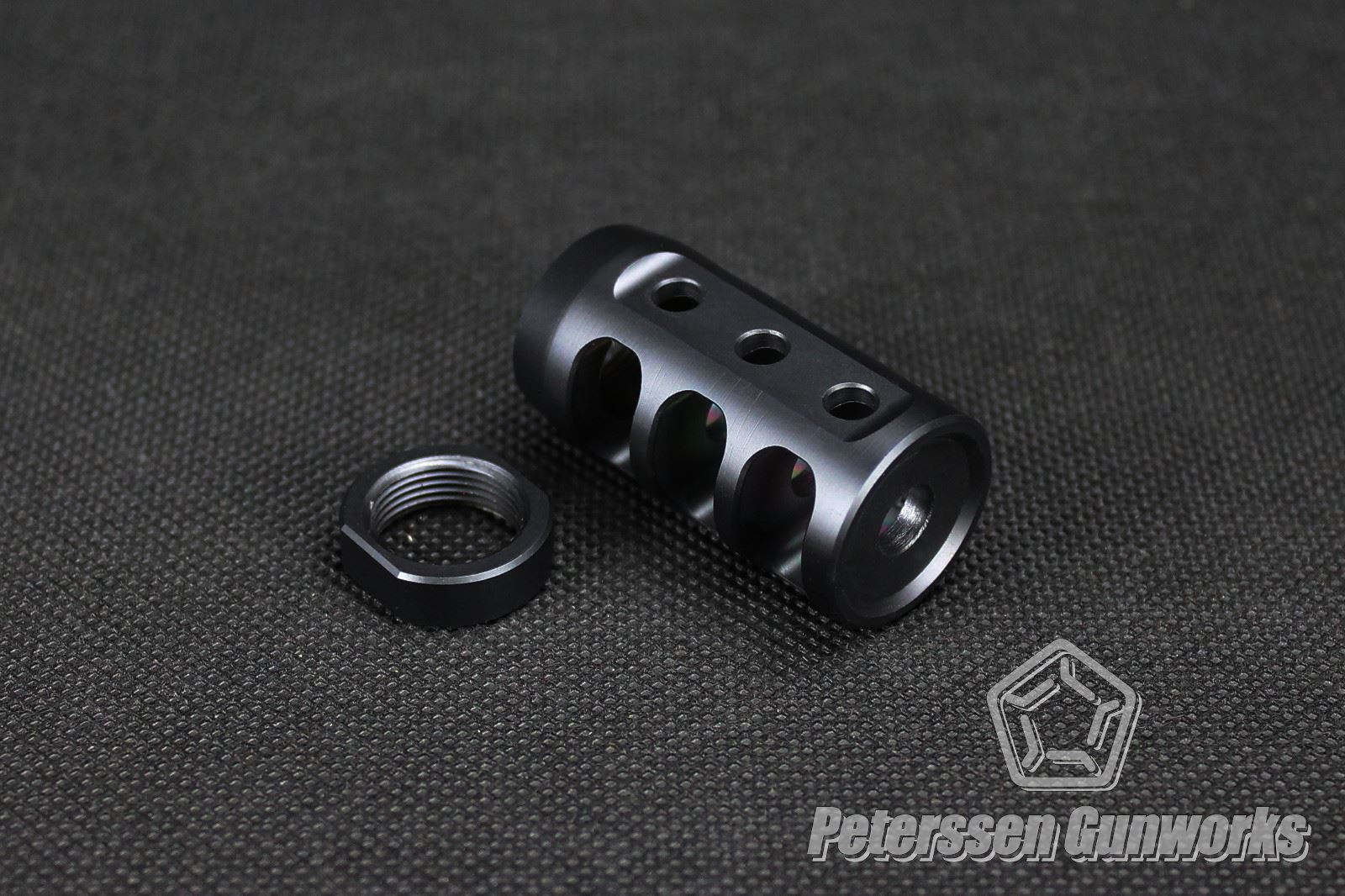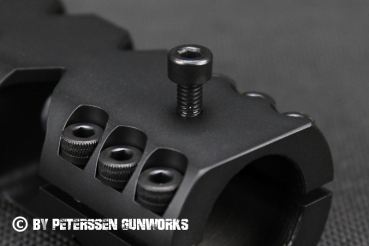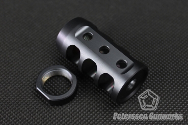 Die 22mm starke zylindrische Schraubbremse vom Typ6V3 fällt sehr kompakt aus und passt somit sehr gut zu dünneren Laufdurchmessern unter 20mm. Alle drei Kammern verfügen auf der Oberseite über eine Bohrung, die den Gasen auch das Ausströmen nach oben erlauben. So kann gezielt dem Hochschlag der Waffe entgegengewirkt werden. Der Bremse liegt eine passende Kontermutter bei, mit der die Bremse bei der Montage auf jedem Gewinde so abgestimmt werden kann, dass sie im aufgeschraubten Zustand korrekt ausgerichtet ist.