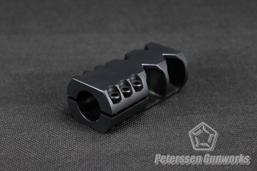 Die Mündungsbremse Typ9V3 wurde speziell für Match-Laufdurchmesser entwickelt. Mit einem maximalen Innendurchmesser von 23,50mm eignet sich der Typ9V3 für alle handelsüblichen Gewindetypen an Matchläufen. Die Gewindeausführung der Typ9V3 besitzt nur zwei Klemmschrauben und garantiert so auch bei besonders druckstarken Kalibern einen sicheren Halt. Auch die schnelle bzw. regelmäßige Demontage wird damit wesentlich erleichtert. Die großen Kammern sind auf der Oberseite mit Öffnung versehen, damit die Gase nicht nur zur Seite abgeleitet werden, sondern auch nach oben. Dies macht den Typ9V3 besonders geeignet für Waffen, die zu starkem Hochschlag neigen.